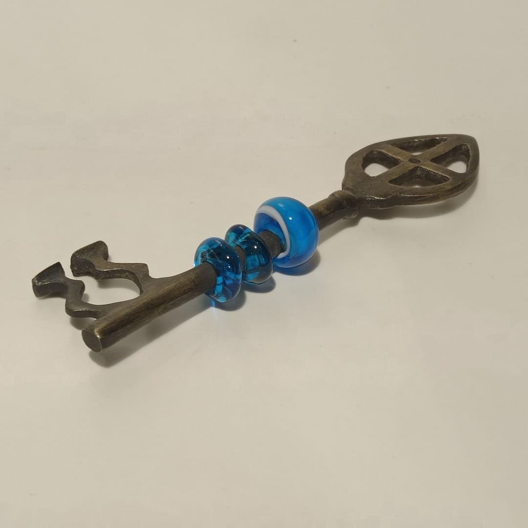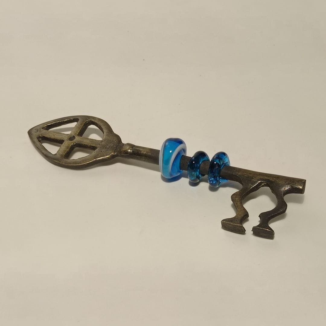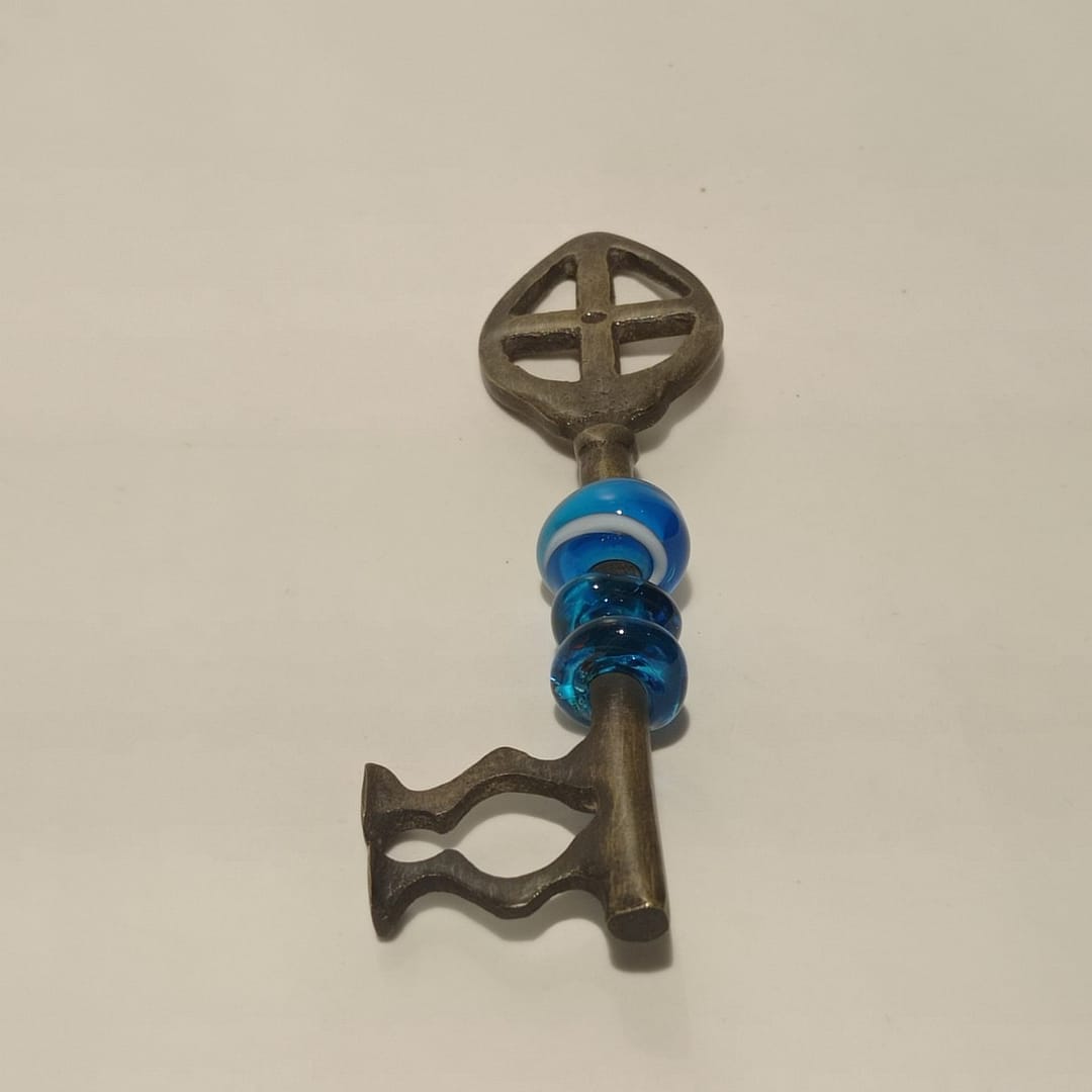 Pirinç Döküm ustası tarafından orjinalinden kopyalanarak yapılmış olan anahtar, atölyemizde alevde şekillendirilmiş olan boncuklar ile süslenmiştir. Boyu: 12 cm. dir.