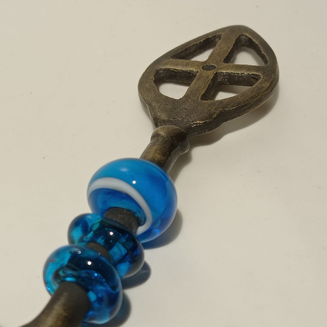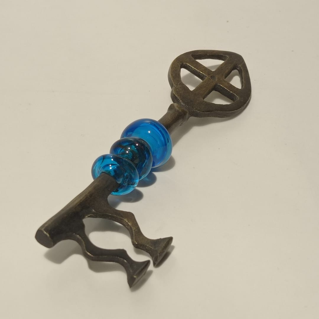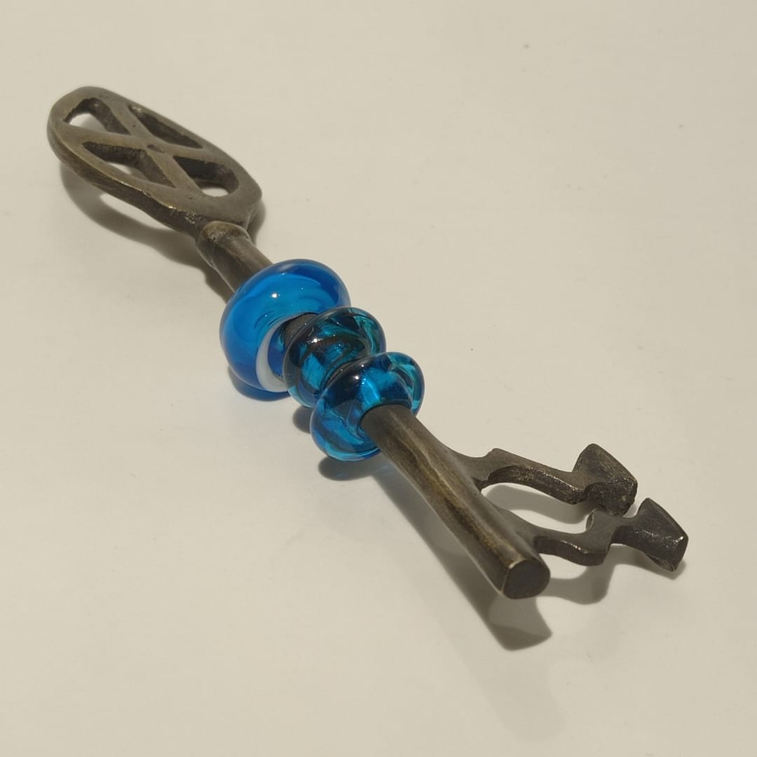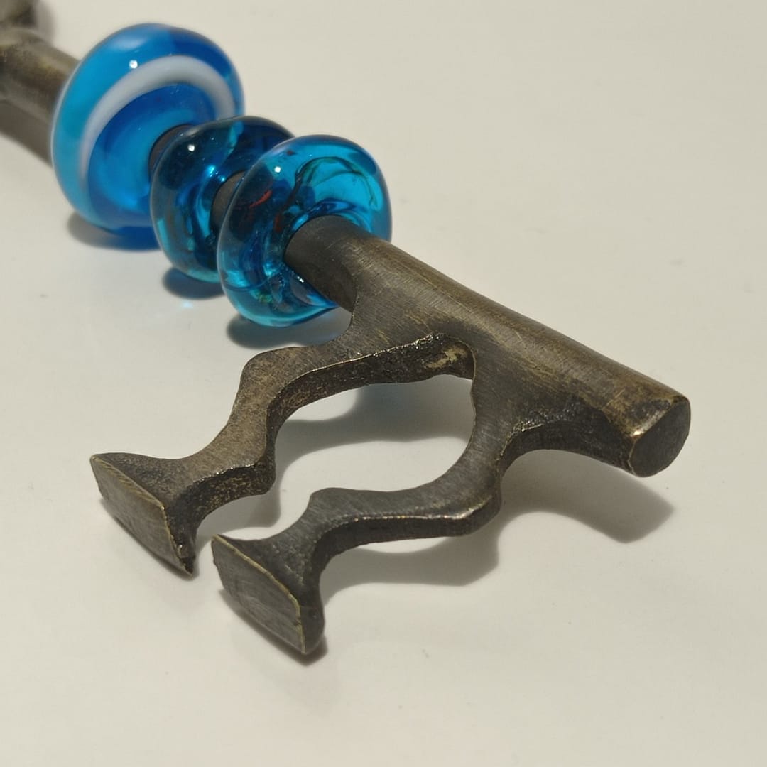 Pirinç Döküm ustası tarafından orjinalinden kopyalanarak yapılmış olan anahtar, atölyemizde alevde şekillendirilmiş olan boncuklar ile süslenmiştir. Boyu: 12 cm. dir.